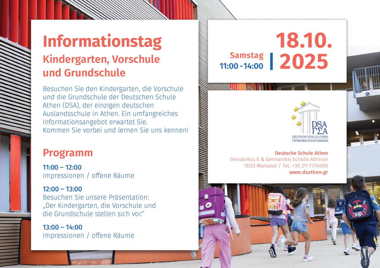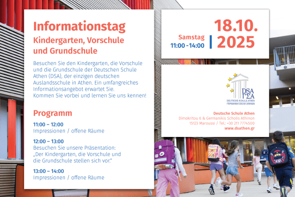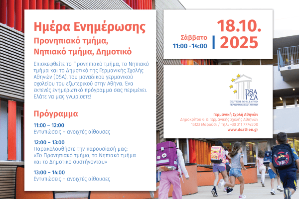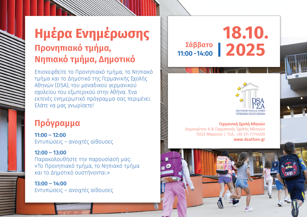 Το Σάββατο 18.10.2025 θα πραγματοποιηθεί από τις 11:00 έως τις 14:00 ενημερωτική εκδήλωση σχετικά με την εισαγωγή στο Προνηπιακό τμήμα, το Νηπιακό τμήμα και το Δημοτικό της Γερμανικής Σχολής Αθηνών.