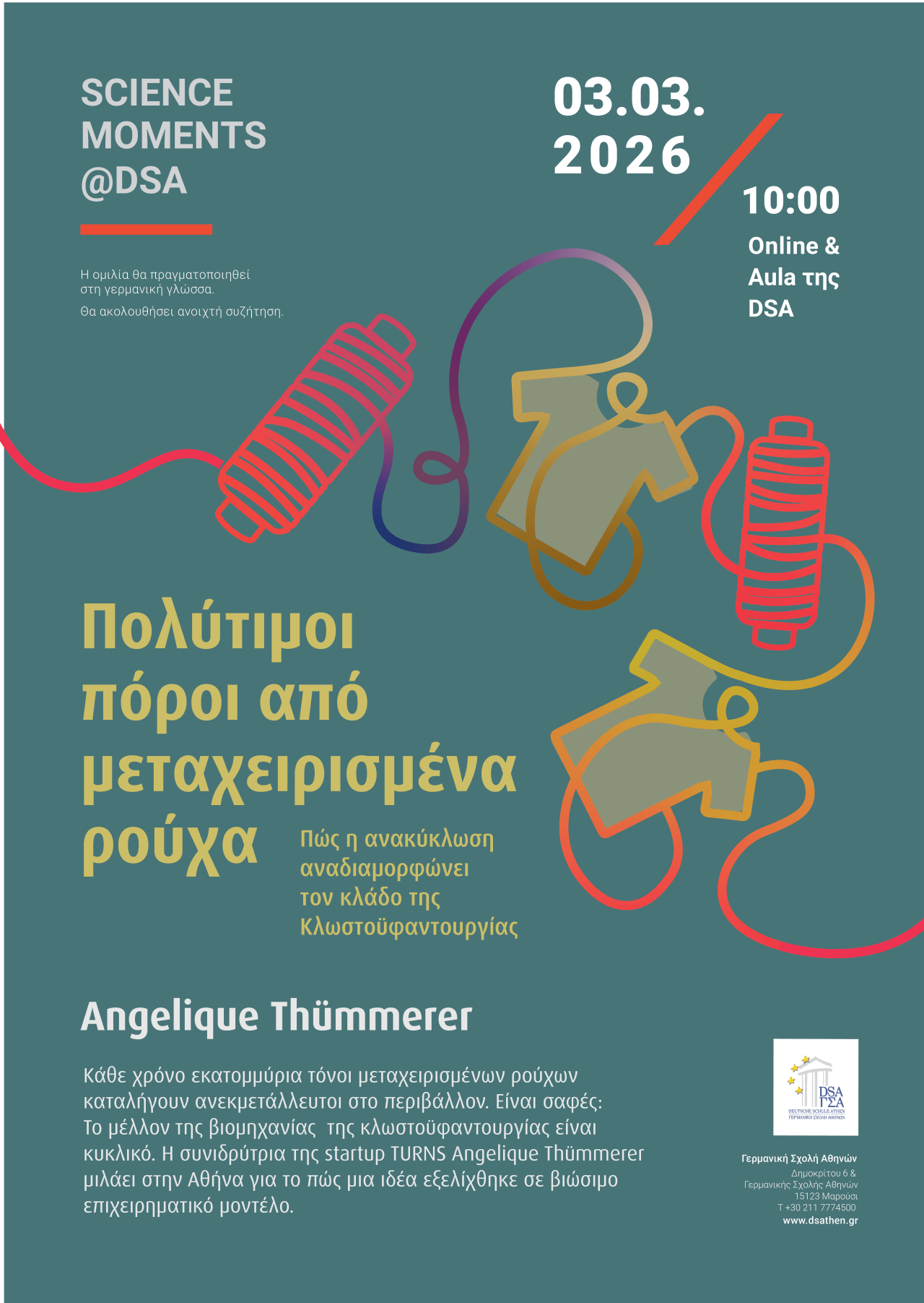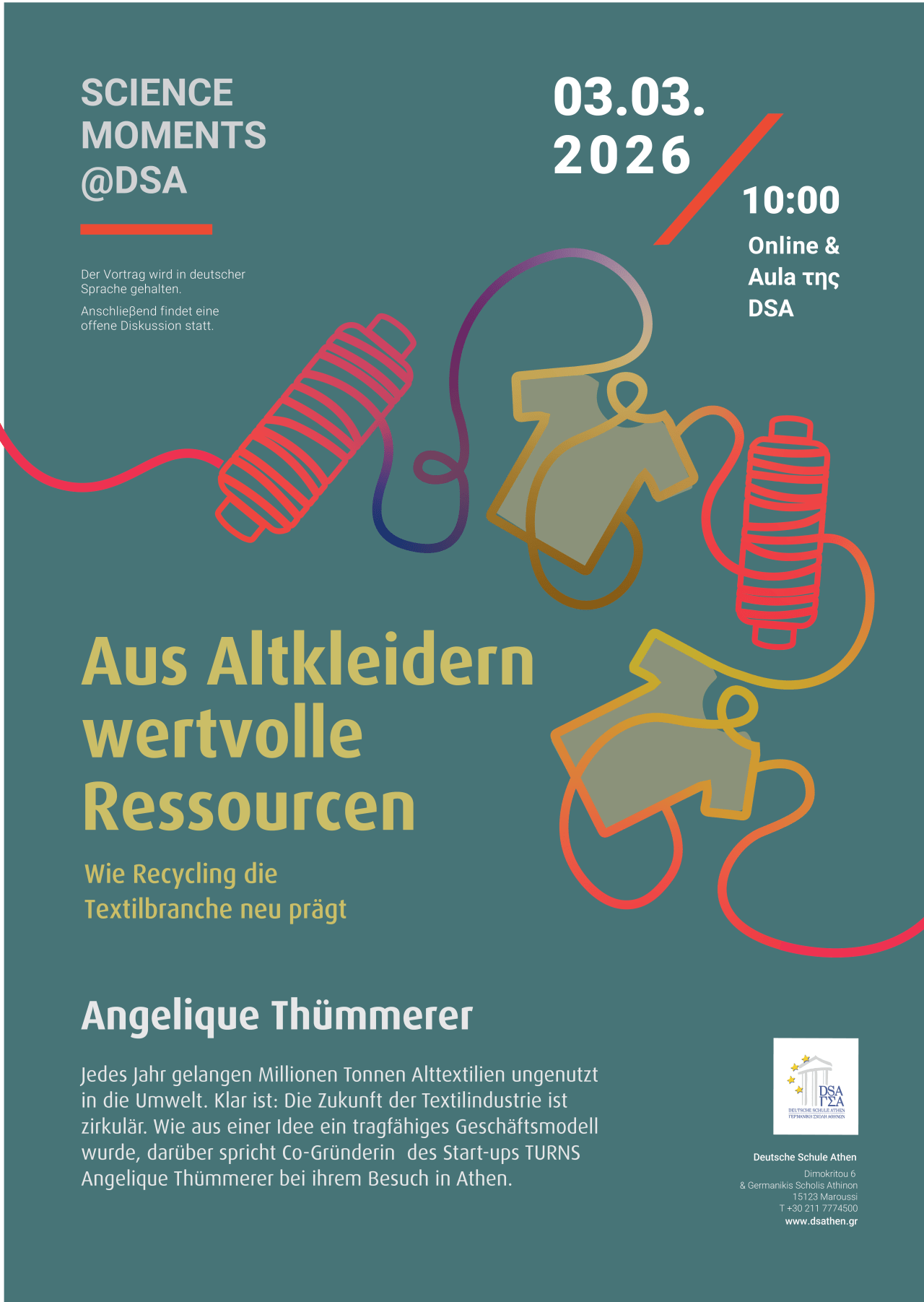 Με ιδιαίτερη χαρά θα υποδεχθούμε στο αμφιθέατρο της Σχολής μας, την Τρίτη 3 Μαρτίου 2026, στις 10.00 π.μ., την κυρία Angelique Thümmerer, στο πλαίσιο της σειράς εκδηλώσεων των Φυσικών Επιστήμων, Science Moments. Η ομιλήτρια θα αναπτύξει το θέμα: «Πολύτιμοι πόροι από μεταχειρισμένα ρούχα. Πως η ανακύκλωση αναδιαμορφώνει τον κλάδο της κλωστοϋφαντουργίας.» παρουσία των μαθητριών και μαθητών της 11ης και 12ης τάξης και στη συνέχεια θα δεχθεί ερωτήσεις από το κοινό και θα ακολουθήσει ανοιχτή συζήτηση.